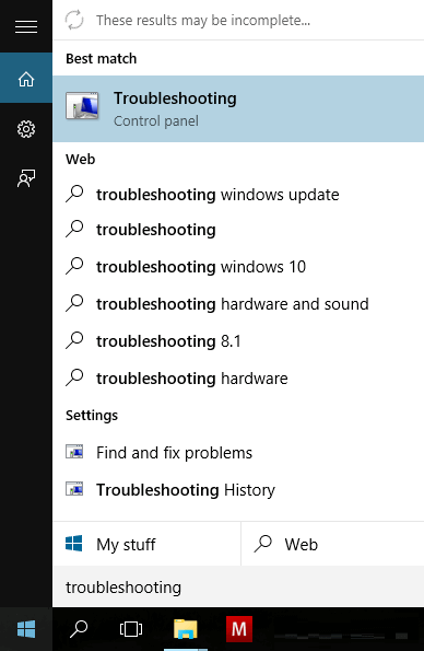 Step 1. Click Start menu and type troubleshooting in search box. Then click "Troubleshooting" in searching box.