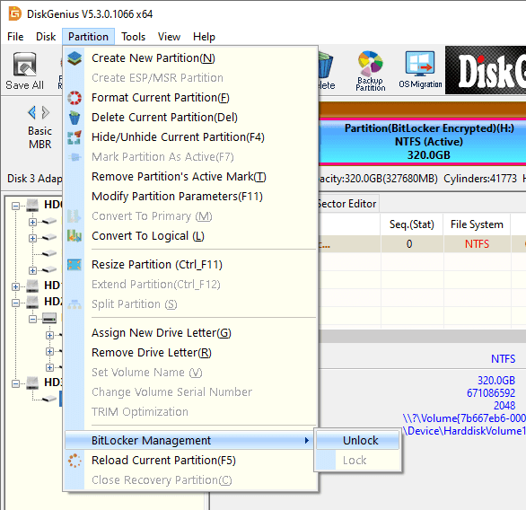 DiskGenius supports to unlock BitLocker drives with password, recovery key or BEK file, and it can unlock BitLocker encrypted drive on computers whose system does not support BitLocker, such as Windows 10/8/7 Home edition, Windows XP and WinPE.