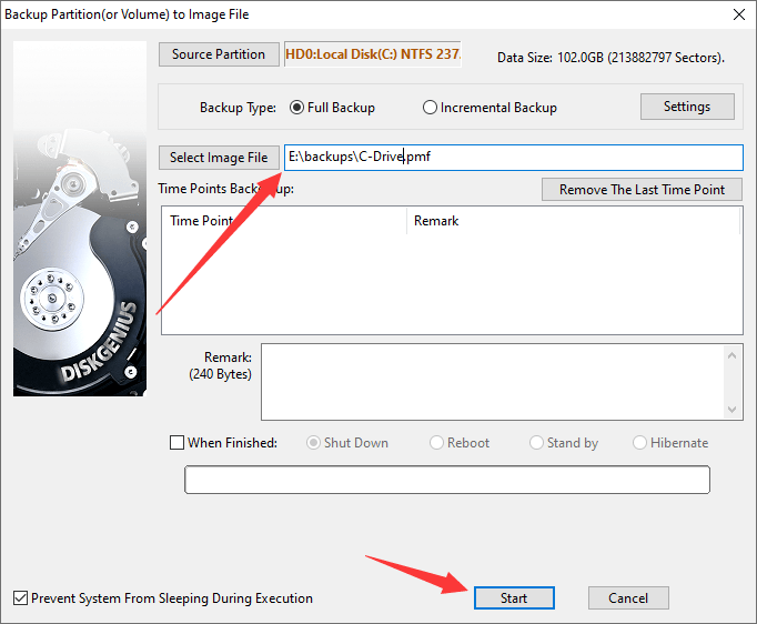 Step 2. Click the Select Image File button, and you can brwose your computer to specify a location for the image file and name the image file. Then click Start button, and DiskGenius will backup the Windows system partition.